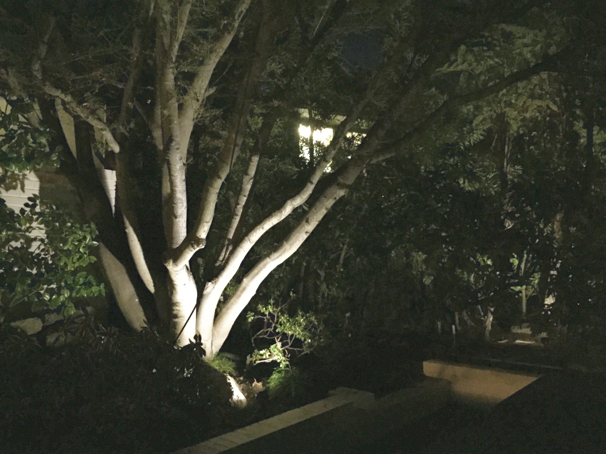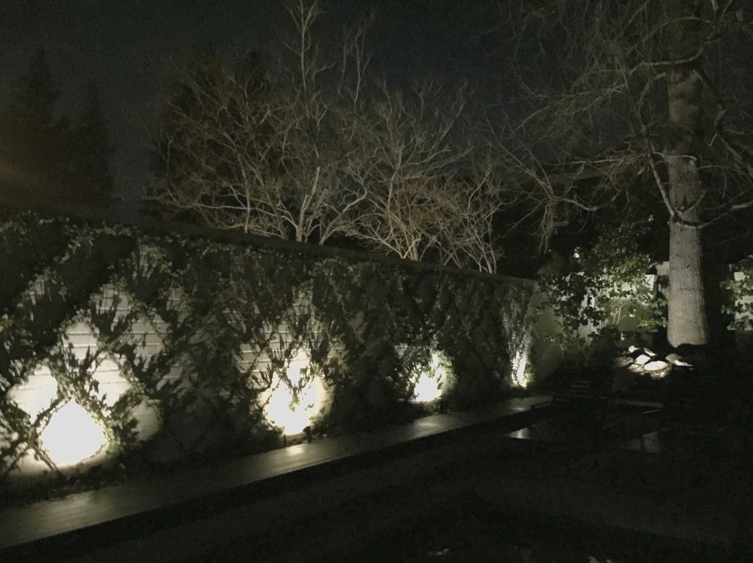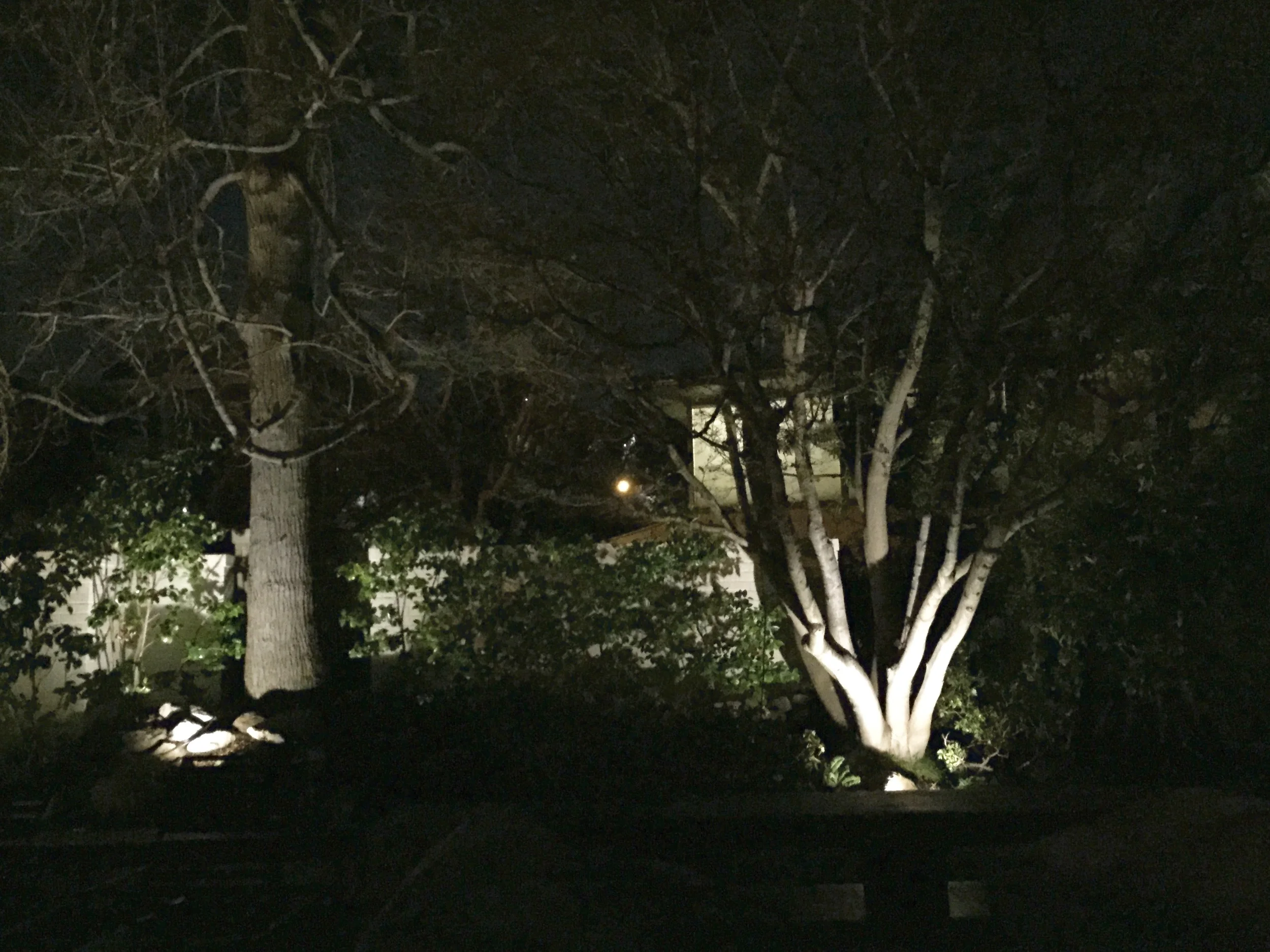 Below are photos of a recent light installation I designed. The photos show what the garden looks like during the day and night. This particular garden has mature plant material, so using up-lights to accent the existing sculptural planting was a must. A moonlit effect over the parterre garden was created by using soft down-lights.
